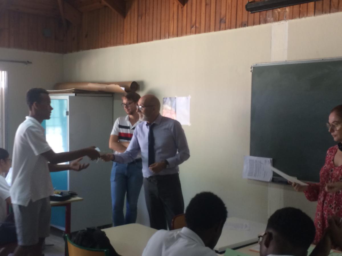 Monsieur Fachan a tout d'abord félicité les élèves pour leur réussite (100% d'obtention) en soulignant l'importance symbolique de ce premier diplôme officiel à l'image d'une pierre apportée à l'édifice de leur scolarité et de leur avenir. Enfin, il a recommandé aux élèves de garder cet instant présent en le partageant avec leur famille.