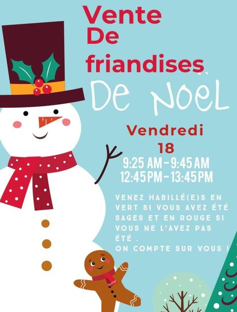 Venez habillé(e)s en vert, si vous avez été sages, et en rouge, si vous ne l'avez pas été. Ce sont les consignes des élèves du CVL et des classes de 1ère qui organisent une vente de friandises, uniquement pour le secondaire (sécurité oblige), demain vendredi pour fêter ensemble Noël et les vacances.